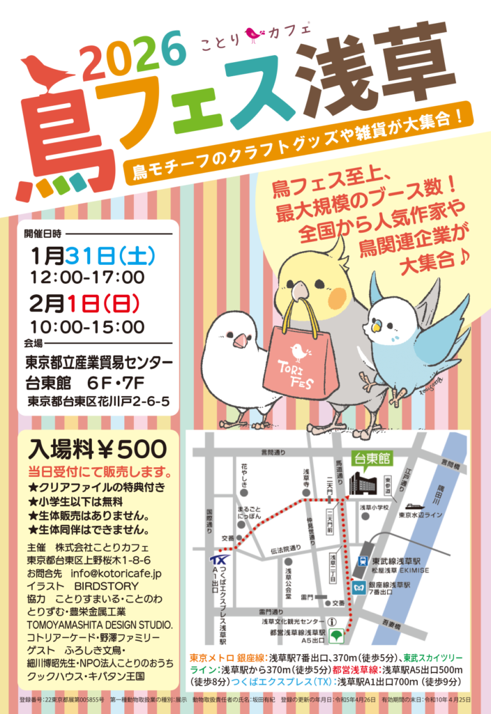 2025/01/31(土)、2/1(日)に開催される「鳥フェス in 浅草 2026」に参加します。(委託販売)