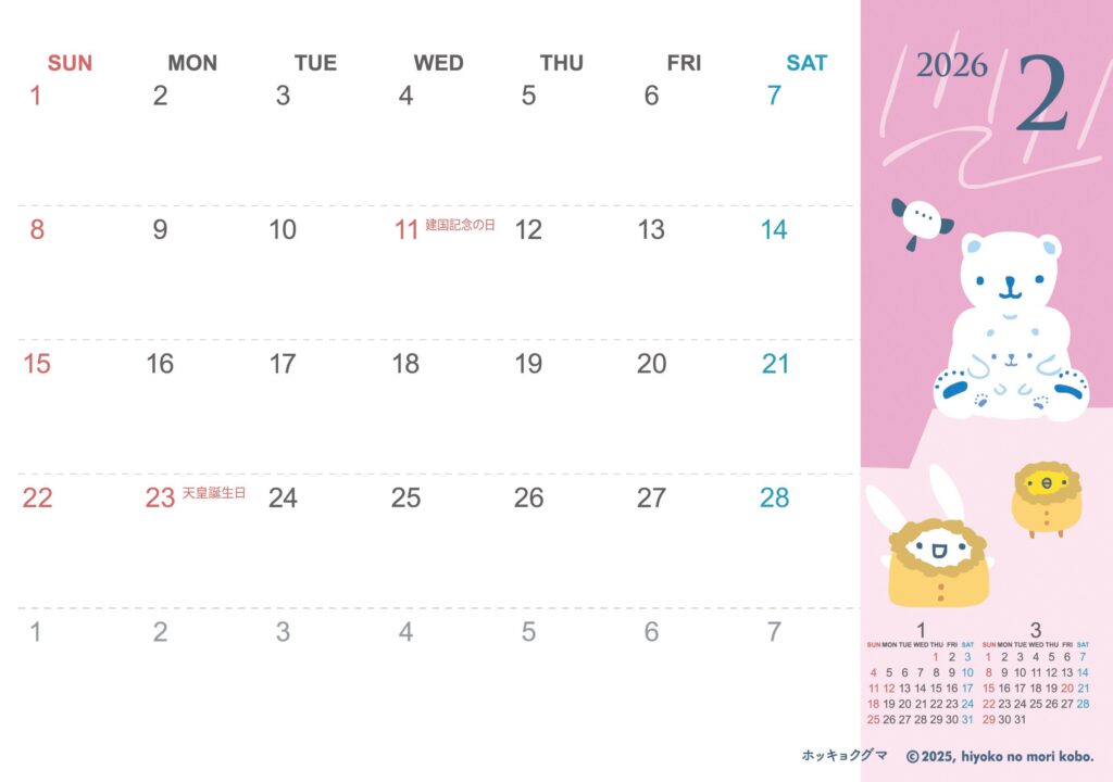 2月のカレンダーを公開しました。よかったらご利用ください。